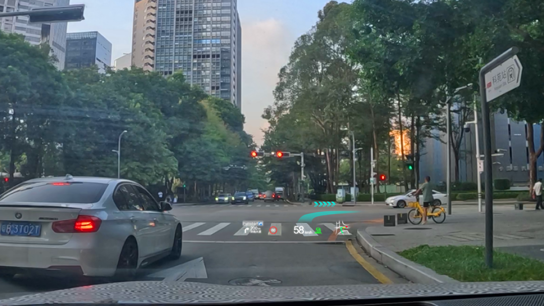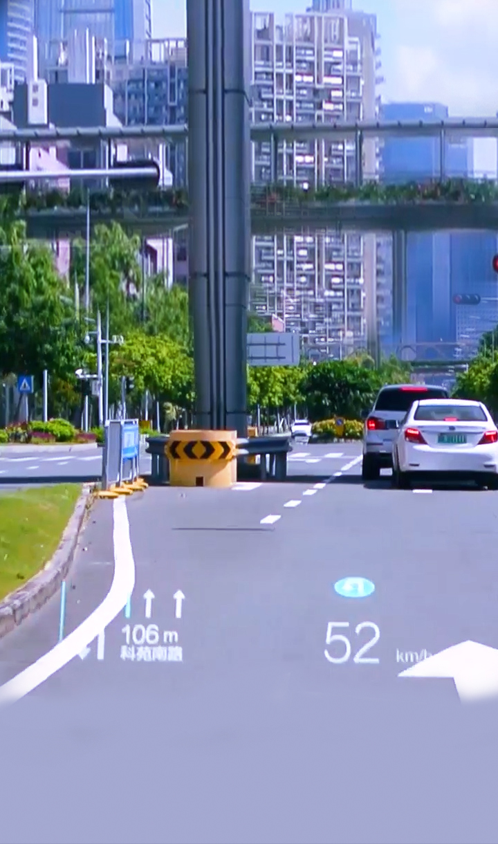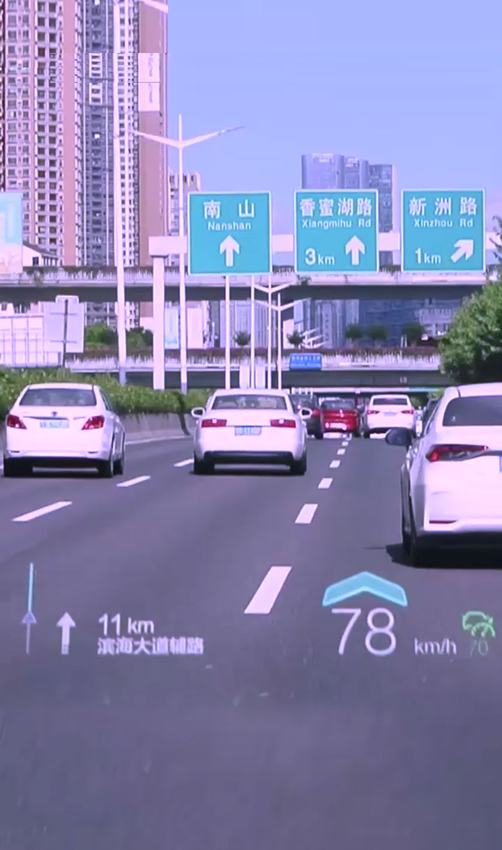 基于復(fù)雜變量環(huán)境完成大尺寸、小體積的光機(jī)設(shè)計(jì),并采用多數(shù)據(jù)融合算法實(shí)現(xiàn)導(dǎo)航、ADAS等輔助駕駛信息在真實(shí)路況上的疊加、融合顯示,提升駕駛安全性的同時(shí)給予更酷炫、更智能的駕駛體驗(yàn)。